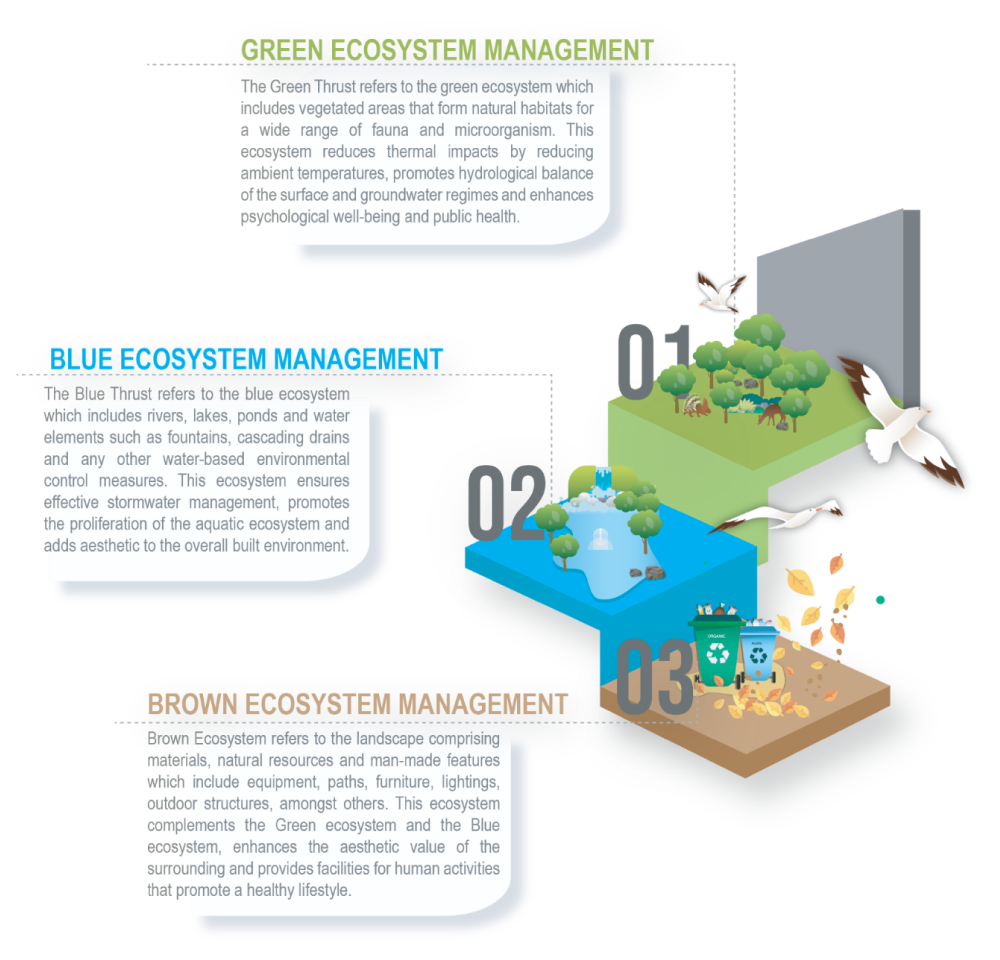 The objectives of the Green Ecosystem policy thrust includes the:Blue ecosystem refers to water bodies which include rivers, lakes, ponds and water elements such as fountains, cascading drains and any other water-based environmental control measures. This ecosystem ensures effective stormwater management, promotes the proliferation of the aquatic ecosystem and adds aesthetic to the overall built environment.