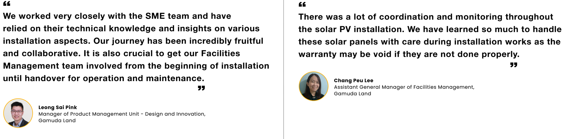 Behind the scene, the solar PV installation project was led by Leong Sai Pink, Gamuda Land Manager of Product Management Unit – Design and Innovation, in close collaboration with Chang Peu Lee, Gamuda Land Assistant General Manager of Facilities Management, and two of our Subject Matter Experts (SMEs) – Puganesan Thiruselvan, Gamuda Engineering Head of Renewable Energy and Power System, and Faris Bin Mohd Yusof, Gamuda Engineering Assistant Manager of Renewable Energy.