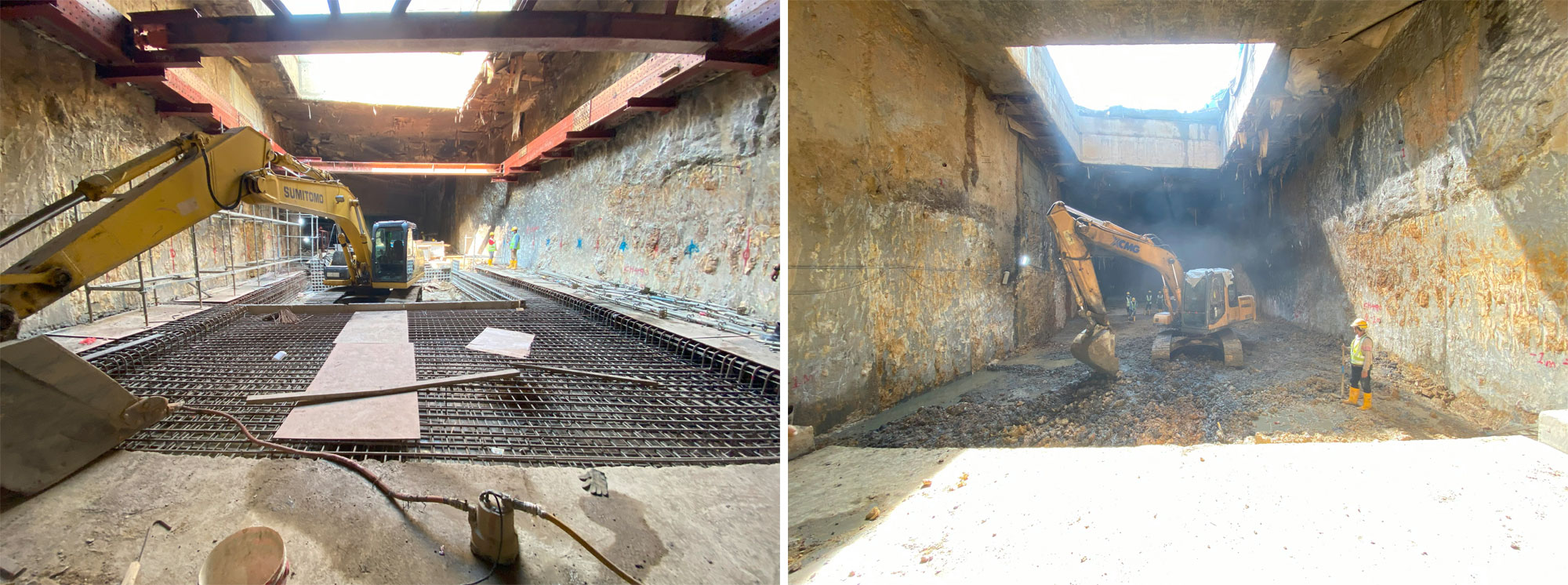 This method is different from the conventional bottom-to-top construction method. It does not require a vast excavation area. All excavation work was done within the two sides of the diaphragm walls. Hence, the earthworks and structural works reduced the impact on the surrounding environment and minimised the social implications for the public.