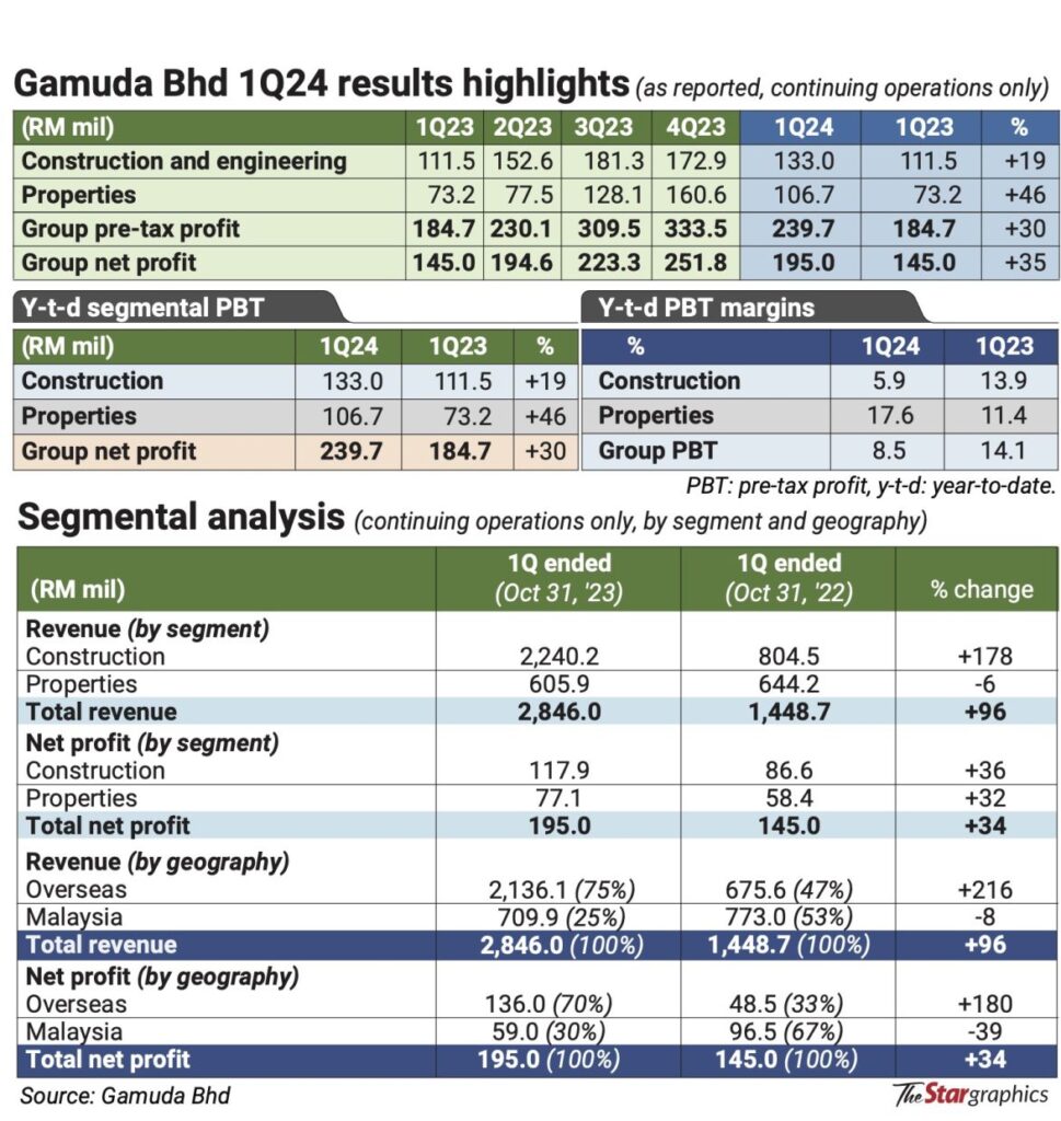 Taking a glance at its results for its first financial quarter ended Oct 31, 2023 (1Q24) – where the group posted a net profit of RM195mil on a revenue of RM2.85bil – it is revealed that external projects have actually contributed to 70% and 75% respectively to the aforementioned metrics.