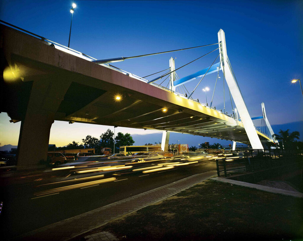 As the bridge and highway were to be constructed at a very busy intersection of an industrial park, we had to find ways to minimise disruption to the local traffic below. A cable-stayed concept can be built with a central span of about 200 metres, so it does not have to have columns at the bottom, interfering with traffic.
