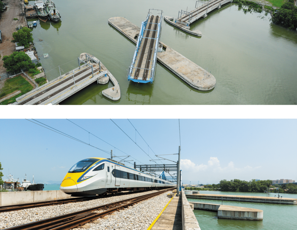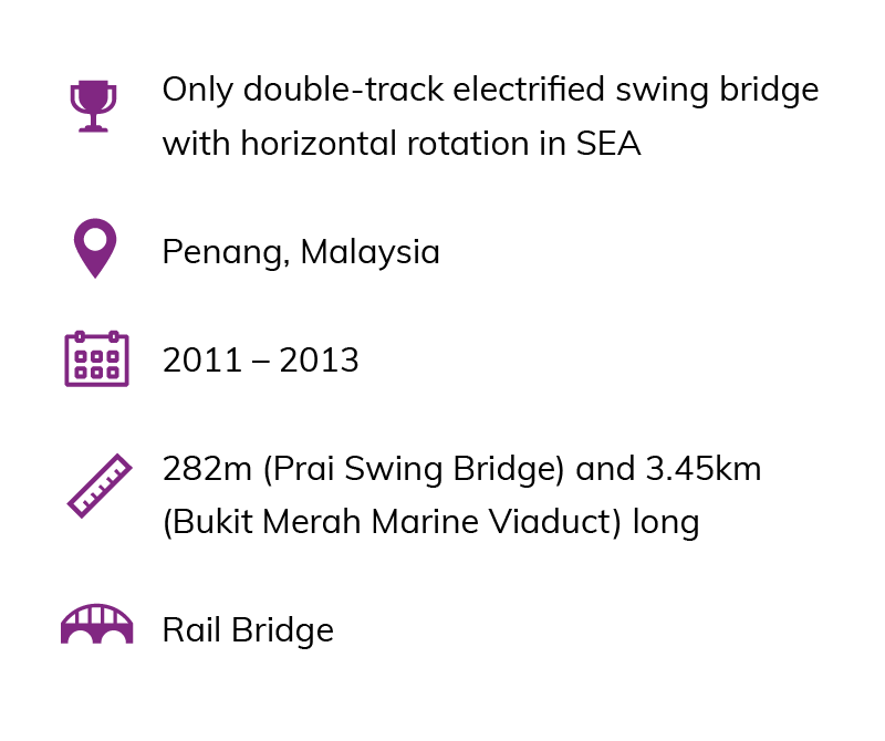 Movable bridge systems are among the most remarkable in bridge construction. This unique bridge swings horizontally, opening at a 72° angle, accommodating vessels to cross the Prai River. Its central pivot design optimises electric trains that move at speeds between 140 to 160 kph and requires no counterweights as well as high piers, resulting in significant cost savings for construction and maintenance. The bridge utilises electro-hydraulics system with independent underwater power and backup generators for reliable operation.