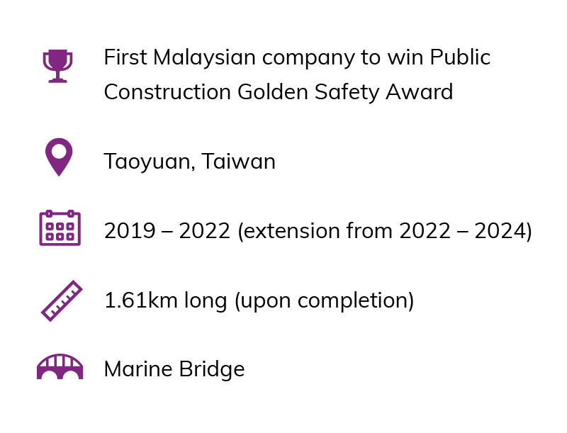 We’re proud to share that this project has been singled out for its rigorous engineering and safety measures to mitigate weather-related risks to marine construction workers. We are the first Malaysian company to win the Public Construction Golden Safety Award from Taiwan’s Ministry of Labour.