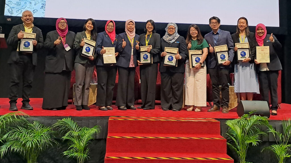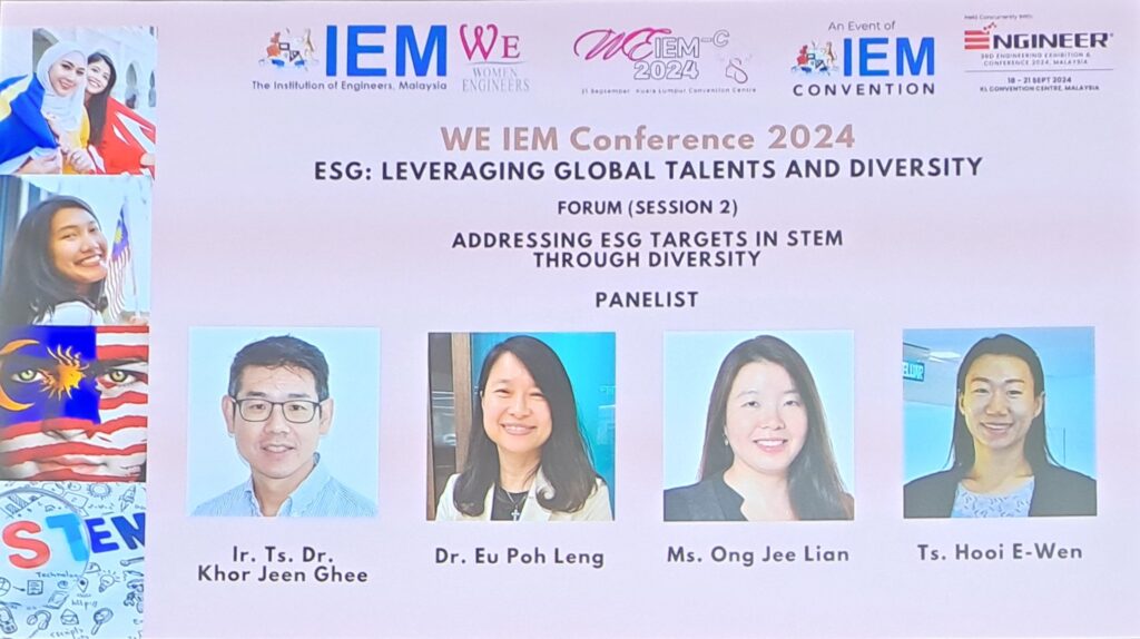 [Right] The panel involved Ir. Ts. Dr. Khor Jeen Ghee (IEM Penang Branch STEM sub-committee lead), Dr. Eu Poh Leng (Director of External Package Innovation, NXP Semiconductors), Ong Jee Lian, and Ts. Hooi E-Wen (Head of Operations Support at Eftech Energy Solutions). [Left] Panellists receiving their tokens of appreciations on stage.