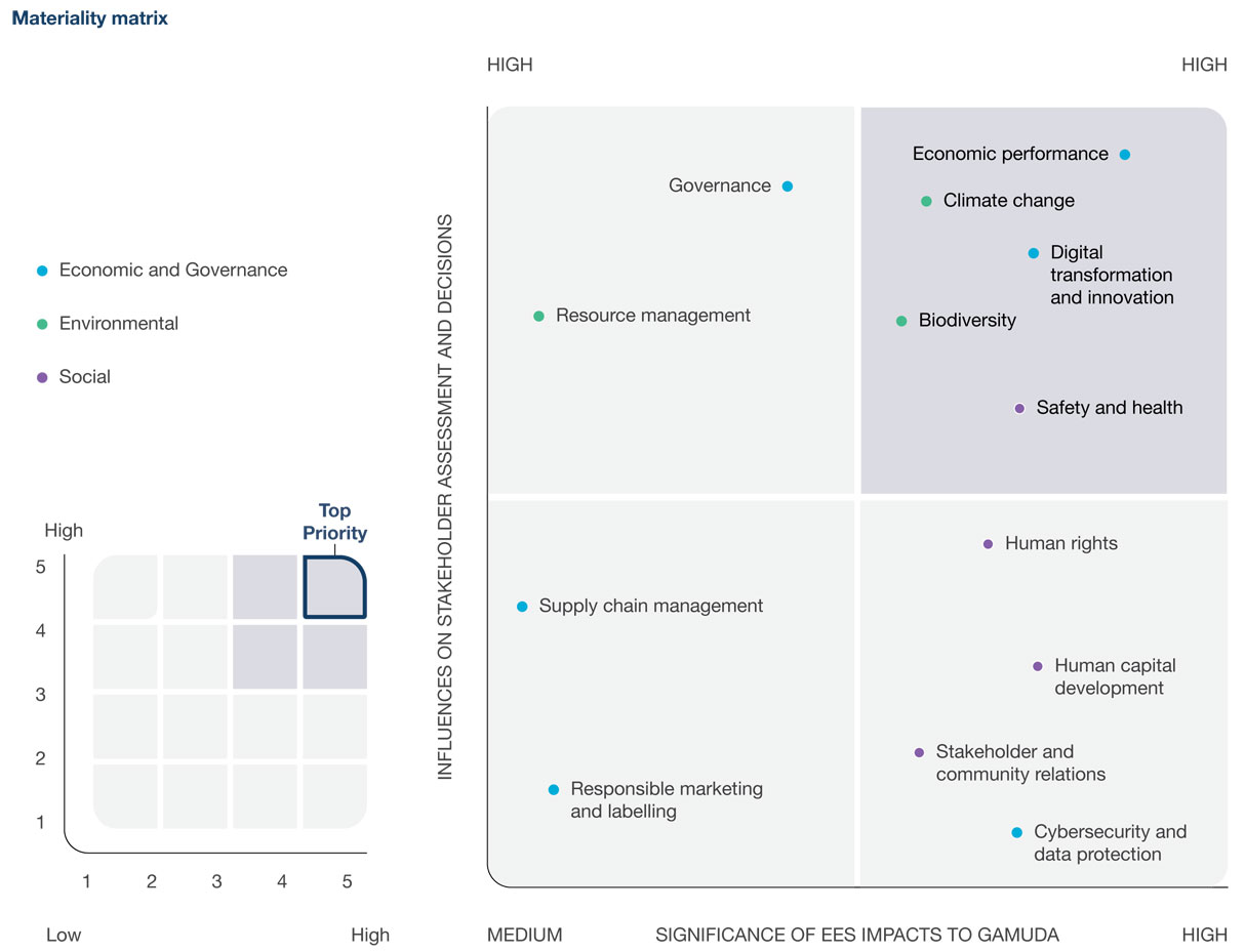 In 2024, we reviewed our material matters by aligning them with industry peers and global sustainability reporting frameworks. Through a process of consolidation and regrouping, we streamlined our material matters from 17 to 13 key issues. As part of this refinement, Indirect Economic Impact was removed from the materiality matrix. Despite these changes, the priority of our top five Materiality Matrix remained unchanged.